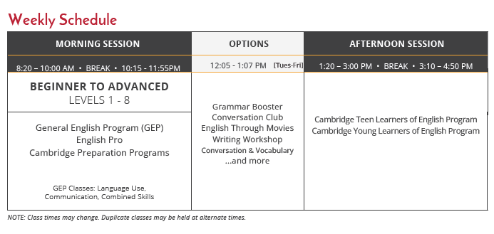 ・午前クラス(GEP / English Plus / English Pro / CAE)8:30–12:10 → 8:20–11:55