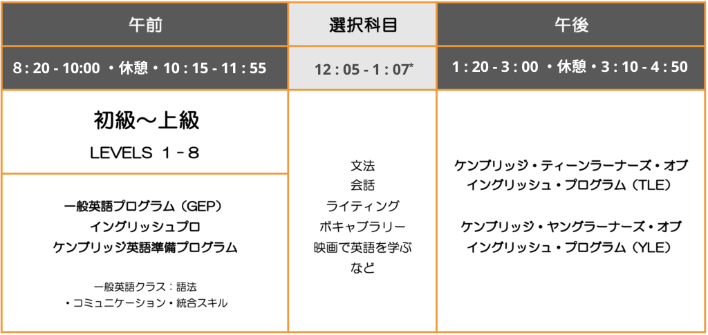 注: クラススケジュールは開講状況により、変更となる場合がございます。